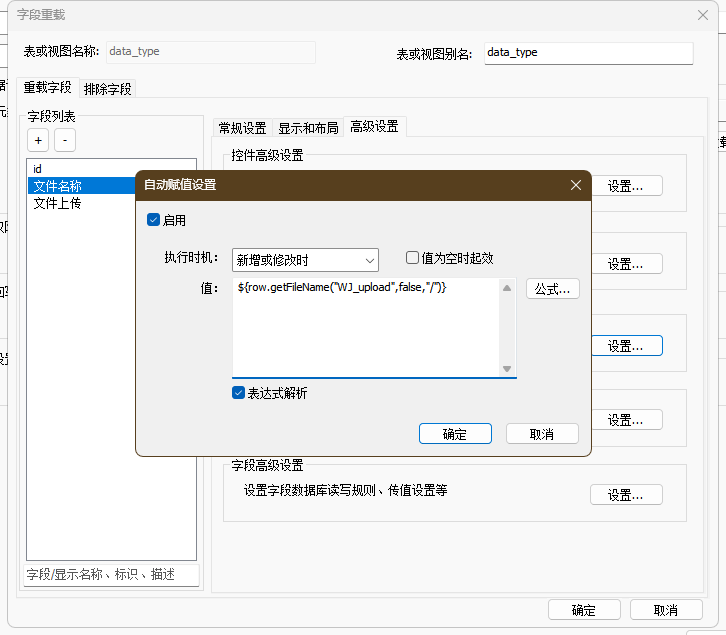 我们就可以在元数据中为字段WJ_name设置在新增或修改时都去取WJ_upload的上传文件名称值用于自动赋值,如下图所示。