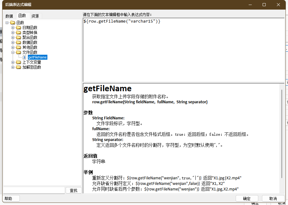 - 函数书写格式:${row.getFileName()},可设置三个参数:文件字段标识、是否返回文件格式后缀、返回多个文件名称时的分割符。一般情况下使用方式如下:${row.getFileName(“wenjian”,true,”|”)} 返回”X1.jpg|X2.mp4”。