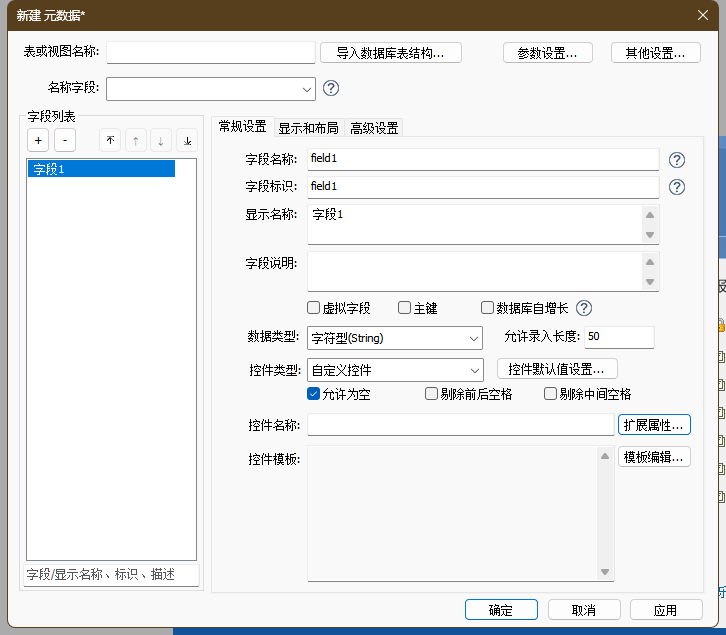 - 支持控件高级设置、校验设置、自动赋值设置和字段高级设置等,详细配置说明请查阅章节 元数据>字段高级设置