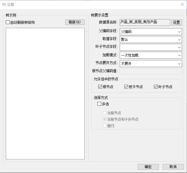 - 父编码字段:选择父编码字段后,控件中的数据以该字段数据为父,构成一个组织树。