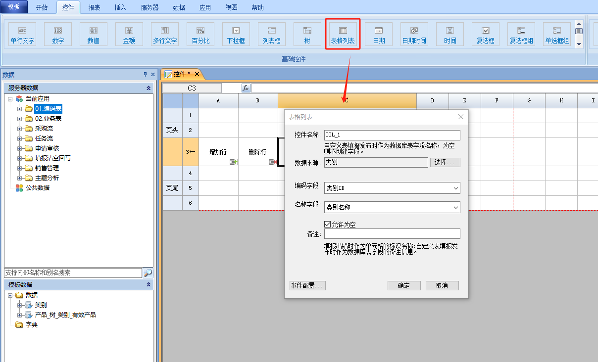 选中单元格,点击[工具栏-控件]中的[表格列表]控件添加到单元格中。