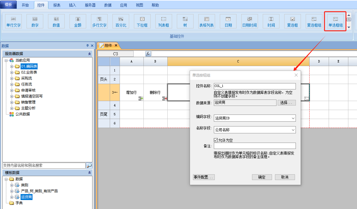 1)添加控件到单元格后,由于该控件为数据源控件,需要配置数据源。