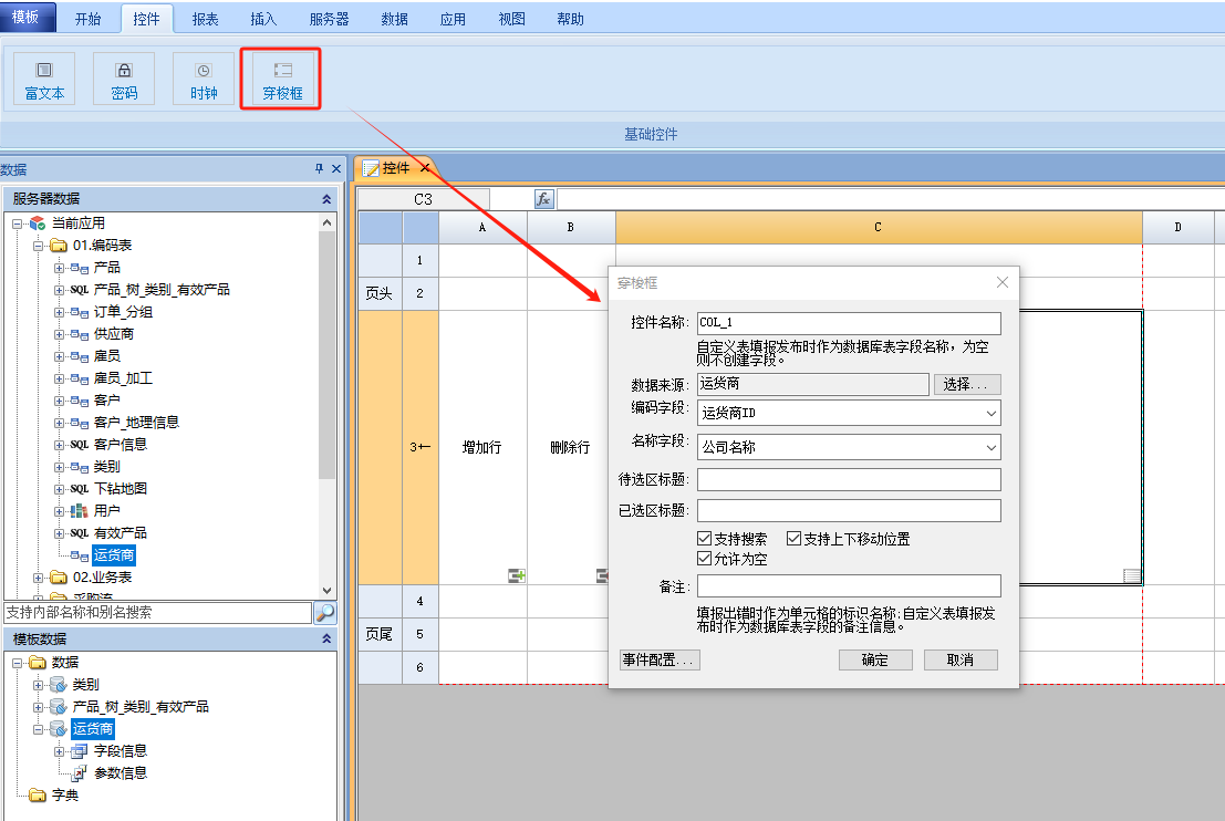 1)添加控件到单元格后,由于该控件为数据源控件,需要配置数据源。