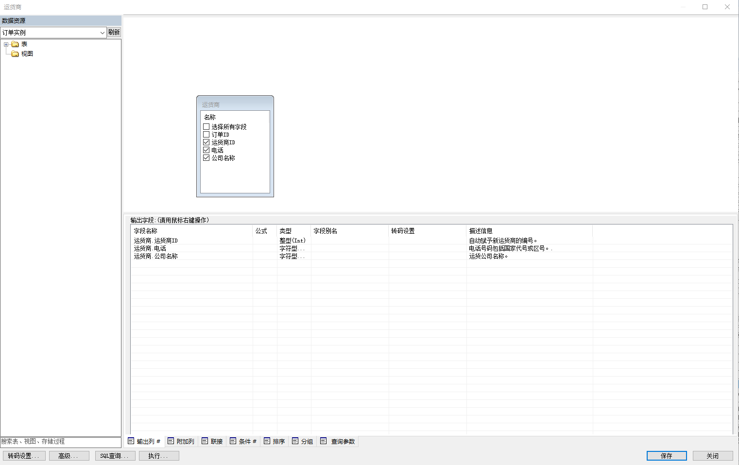 1.新建数据视图[运货商],拖拽[运货商表]到编辑器中,选择表中的字段,查询所选字段的所有数据。