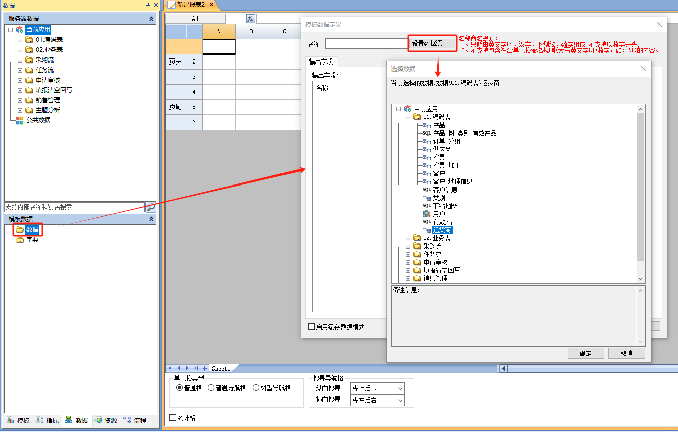 2.数据视图新建完成后,添加该数据视图到单元格表单的[模板数据–>数据]中,用于该表单填报提交数据。在模板数据中选中[数据],鼠标右键点击[新建普通数据源],弹出模板数据定义窗口,选择新建的[运货商]数据视图。