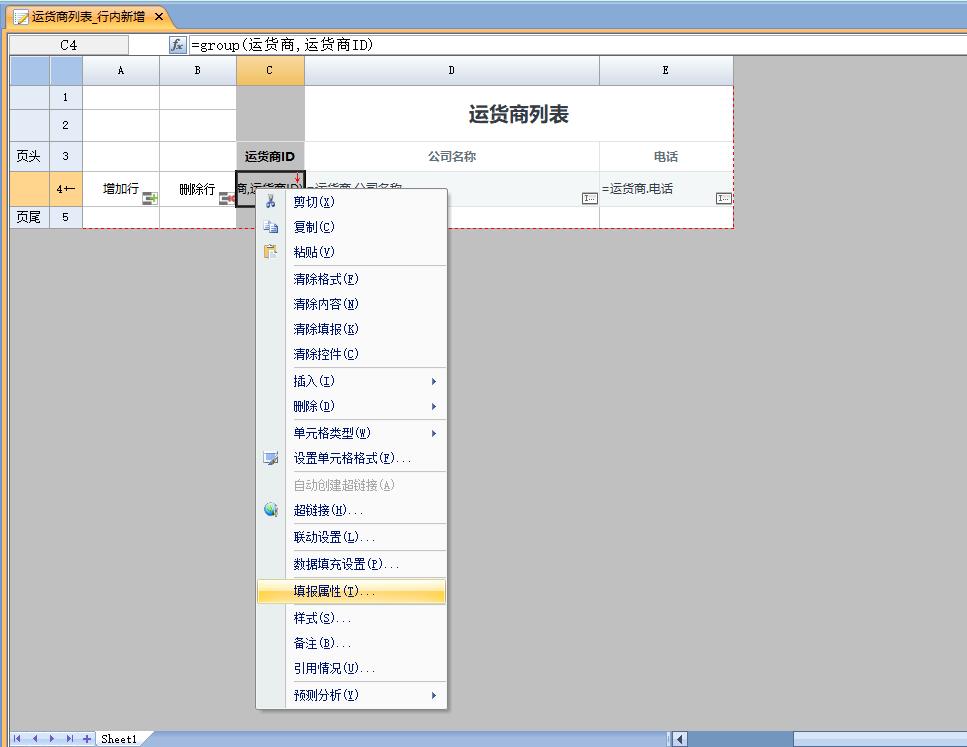 1.选择一个合适的单元格设置填报规则。选中该单元格后鼠标右键–>填报属性,打开填报属性设置窗口。