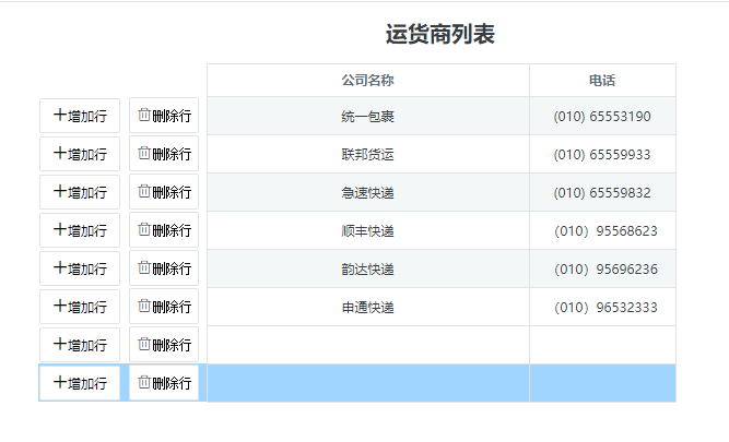 制作一张运货商登记表,使用新增或删除多行的方式新增或删除数据。
