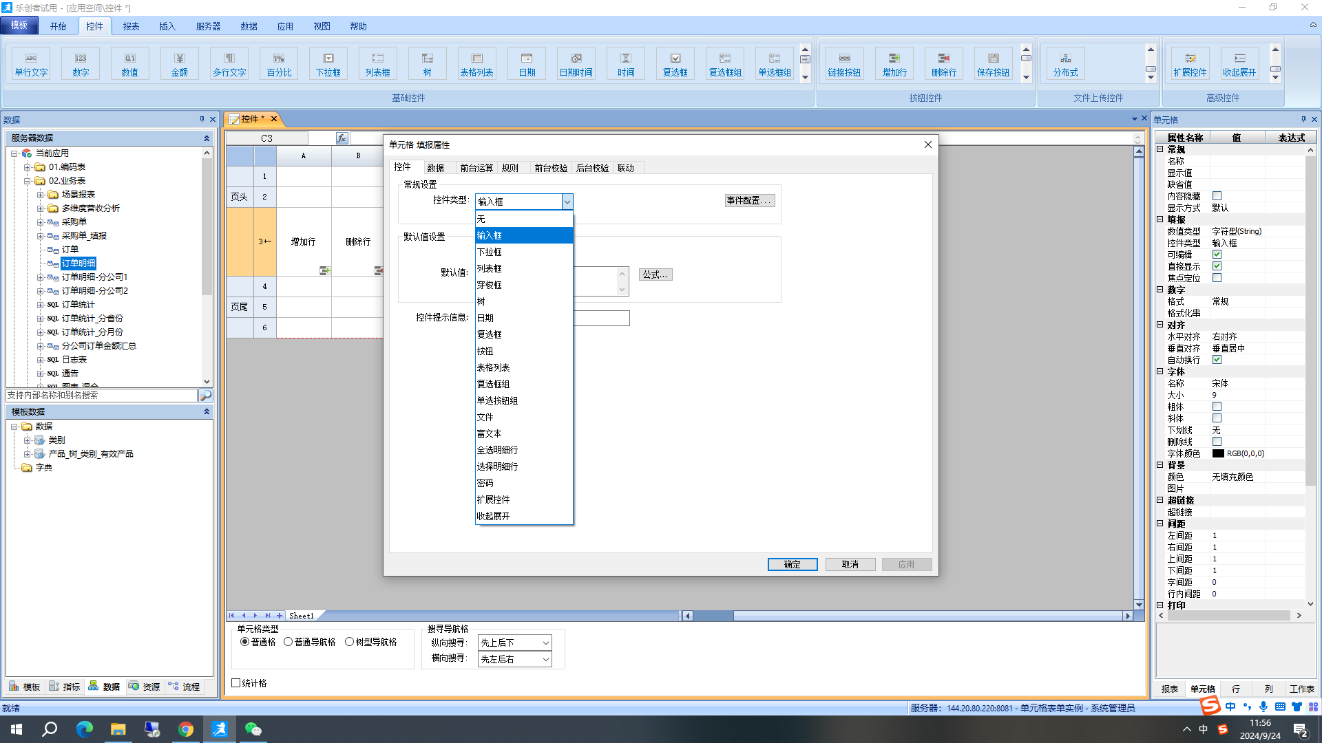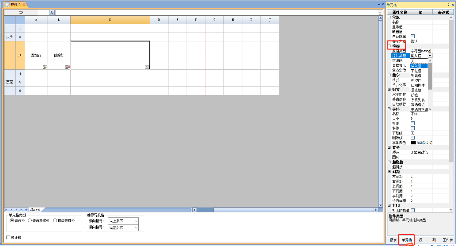 3)选中单元格,在单元格表单属性-单元格属性中,填报属性下点击[控件类型]下拉框,选择自己想要的控件。如下图所示: