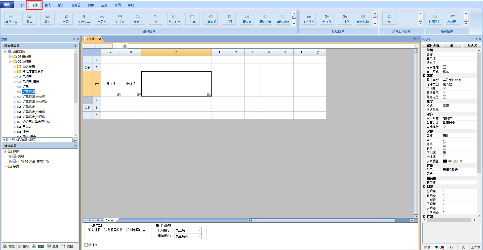 1)选中单元格,点击设计器上方的工具栏[控件]中,选择自己想要的控件添加到单元格中。如下图所示: