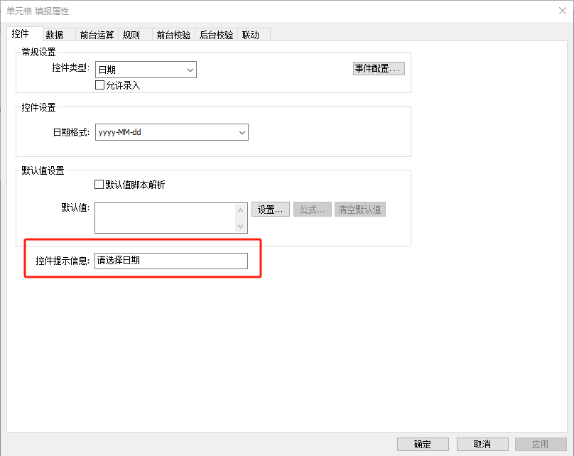 填报时一些输入控件或选择控件在还未输入或选择数据时,希望显示出一个文本提示,只需要再设计模板添加控件时,在控件中设置控件提示信息。控件提示信息功能仅输入类控件、日期类控件和下拉框支持。