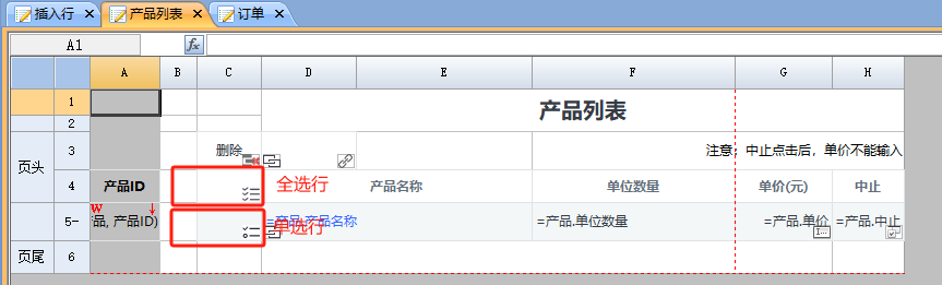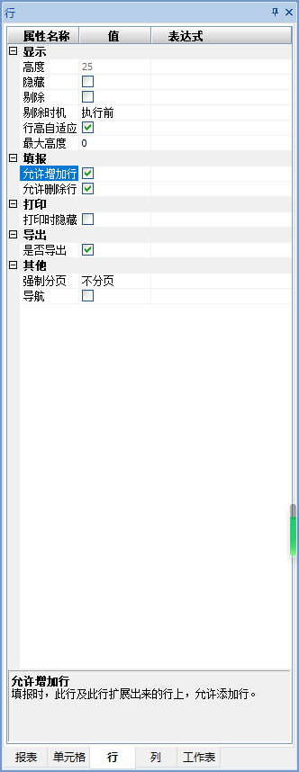 使用插入和删除功能的行需要先开启允许增加、允许删除开关。右侧工具栏-行,允许增加行、运行删除行。设计者可根据需求自行选择是否启用。