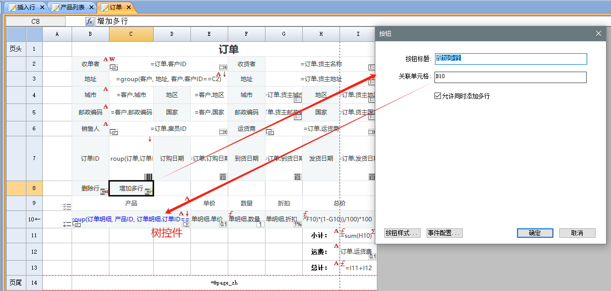 插入支持多选功能需要配合表格列表或树控件使用,当新增行控件关联单元格是表格列表或树控件时,会出选择控件,选择完成后会按照选择内容自动填充插入行;