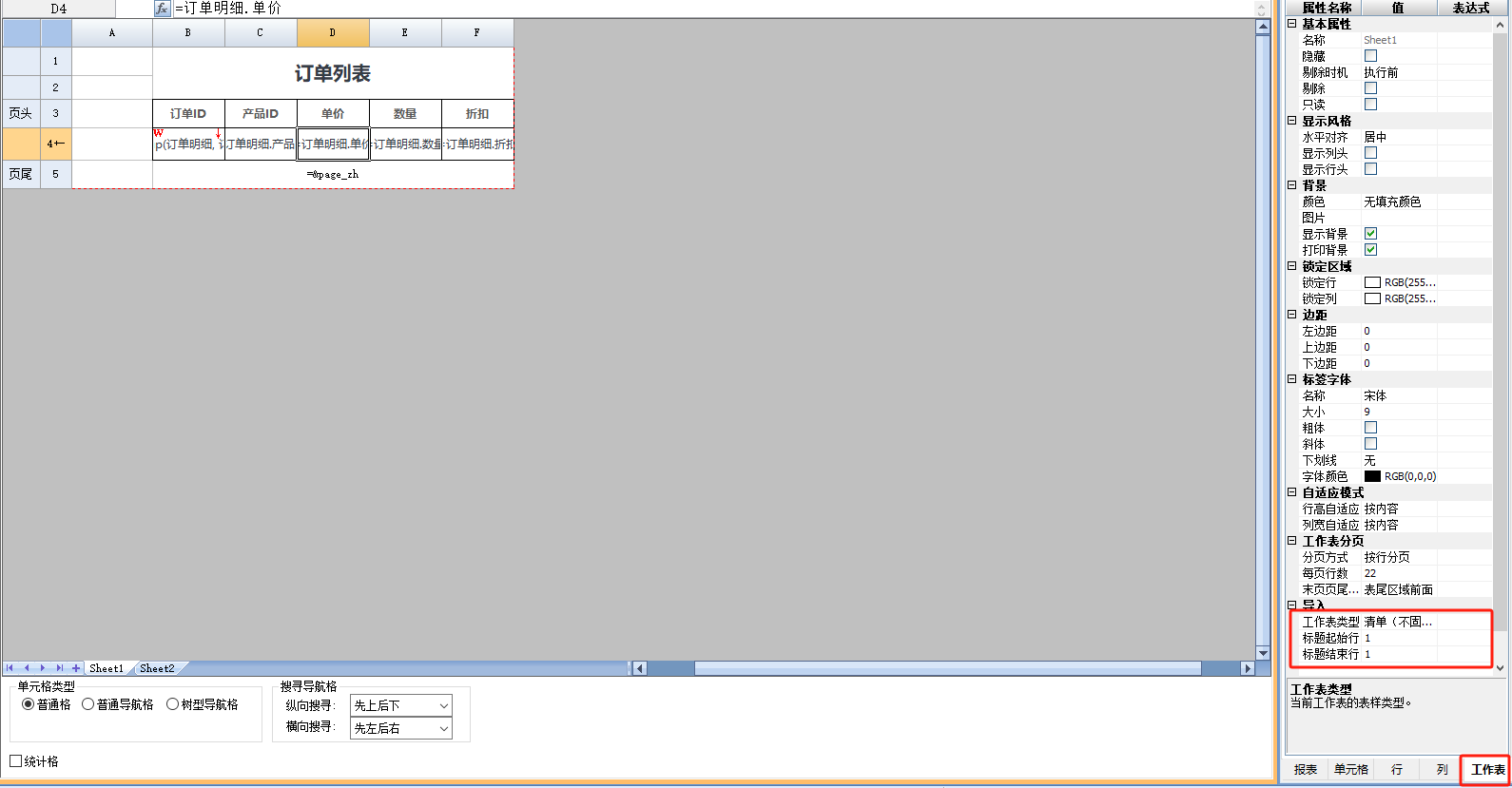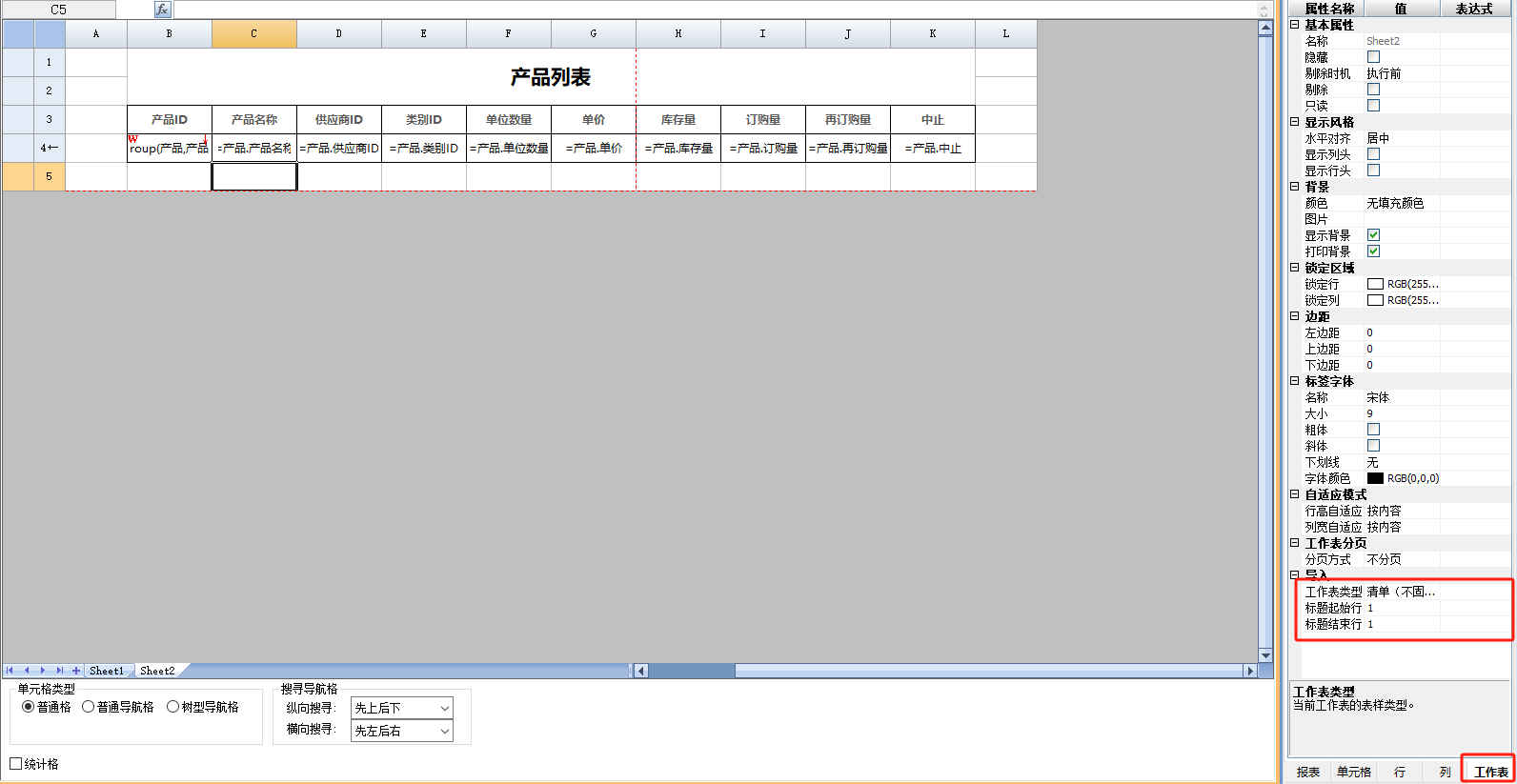 1)新建单元格表单,在表单中添加Sheet,添加数据视图到[模板数据-数据]中,并设计两个Sheet的表样。