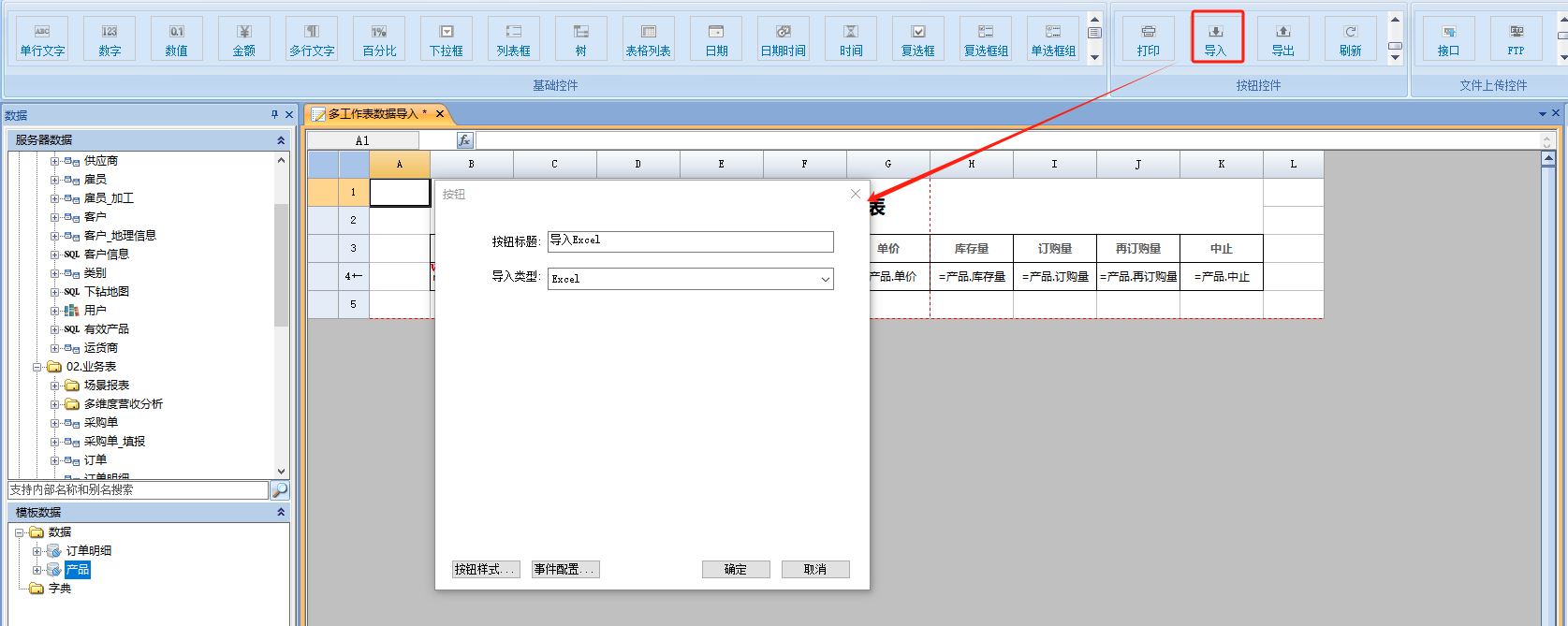 2)选中单元格,点击[工具栏-控件]中的[导入]控件添加到单元格。此方式添加的[导入]按钮只能当前工作表使用,且当前工作表是否可以使用根据当前工作表类型来判断。