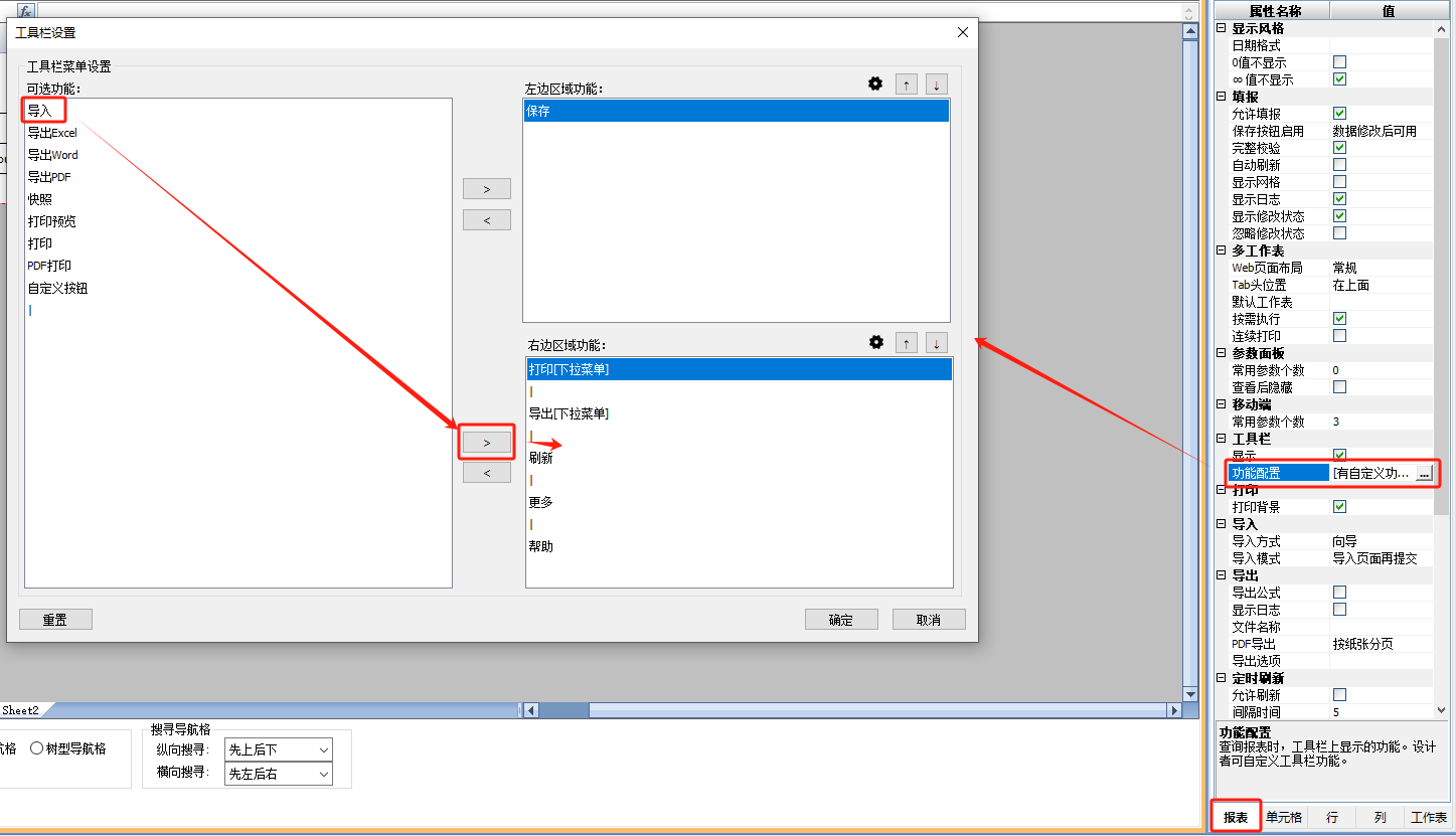 2)在单元格表单中添加导入按钮。点击报表属性[工具栏-功能配置],弹出工具栏设置弹窗,在可选功能中选择[导入]添加到左边区域功能中。