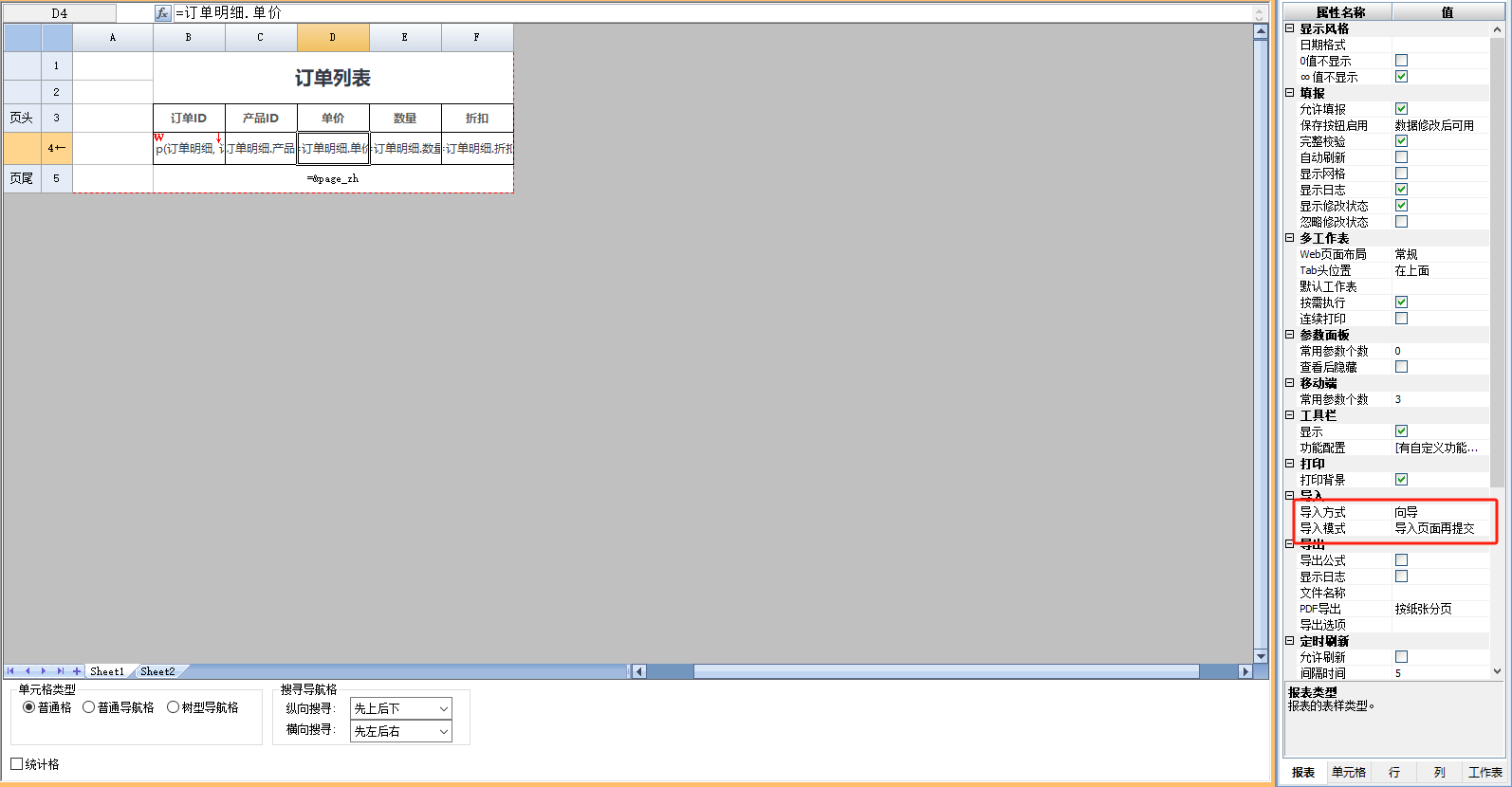 4)在报表属性[导入-导入模式]中模式选择[导入页面再提交]。