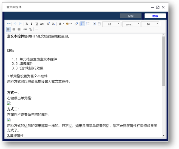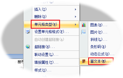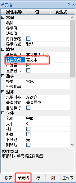 选中单元格,在属性栏单元格属性中[填报-控件类型]中设置控件为[富文本]。