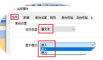 选中单元格鼠标右键,点击[填报属性-控件]中点击控件类型下拉框,设置控件类型为富文本。显示模式可以是[嵌入模式],也可以是[弹出模式],如果是[嵌入模式],数据填报时可以直接在该单元格上编辑富文本;如果是[弹出模式],则点击该单元格后会出现一个富文本编辑器。