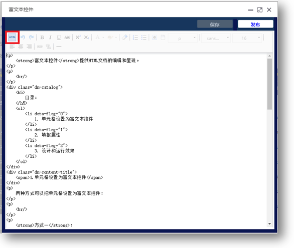 点击工具栏左上方的“HTML”按钮后可切换至HTML的源代码,并可直接针对源代码进行编辑。