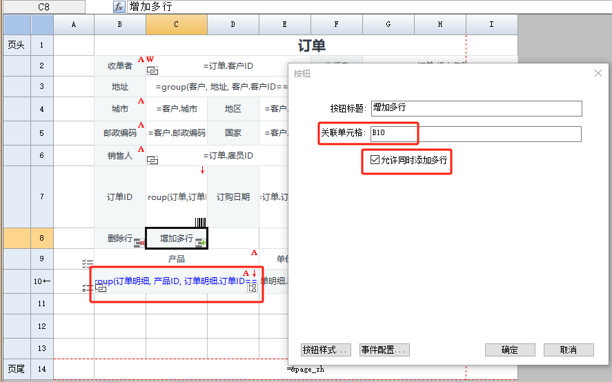 此外,如果一次只想新增或删除一行数据,则配置[增加行]控件时不勾选“允许同时添加多行”,配置[删除行]控件时不与全选行、单选行控件配合使用,只要设置关联单元格为导航格即可。