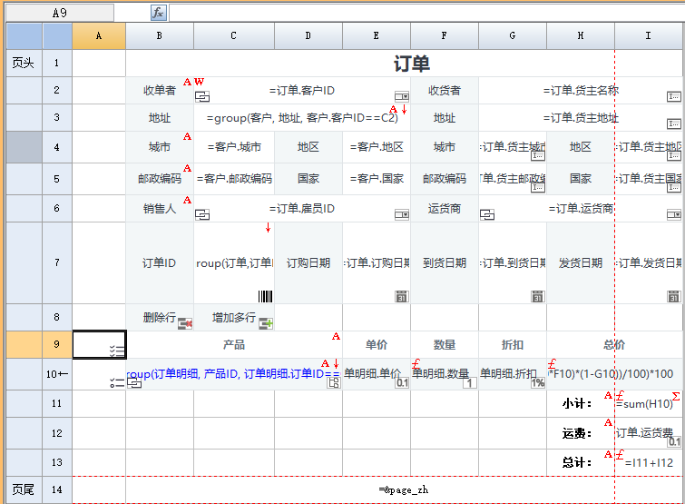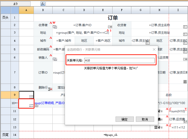 上图中,A9单元格设置了[全选行]控件,A10单元格设置了[单选行]控件,B8单元格设置了[删除行]控件,C8单元格设置了[增加行]控件,B10单元格设置了[树]控件。