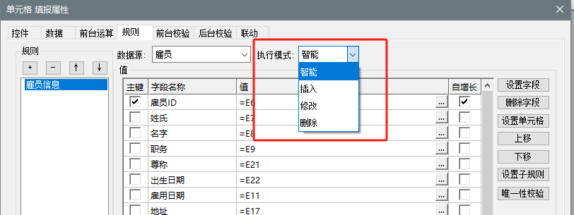 执行模式可以指定sql执行的操作类型,最终映射的时insert、update、delete操作。规则中支持的执行模式有“智能”、“插入”、“修改”、“删除”。非数据库数据视图不支持执行模式,如存储过程、http接口。