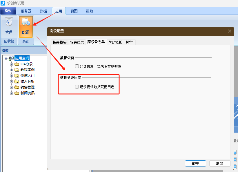 跨设备表单数据变更日志的开启目前细化到应用级别,在各个应用下选择开启,默认不开启。