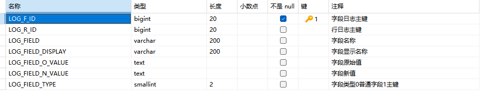 `LOG_F_ID` bigint(20) NOT NULL COMMENT '字段日志主键',