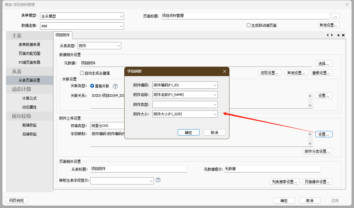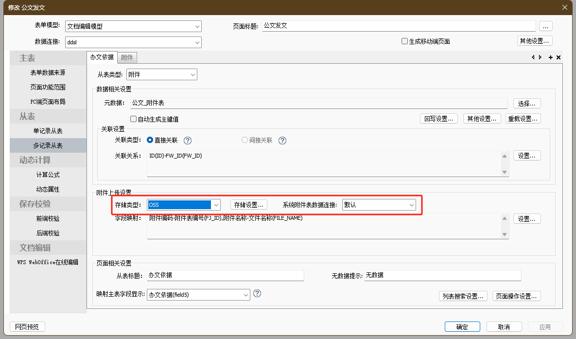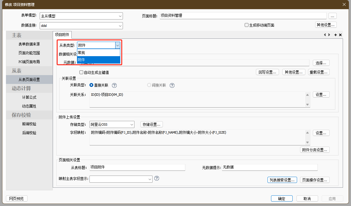 【数据相关设置】选择元数据和【关联设置】主从关联关系配置与常规从表一致,在此不再赘述,下文重点讲解与附件管理相关的“附件”从表专有配置项。