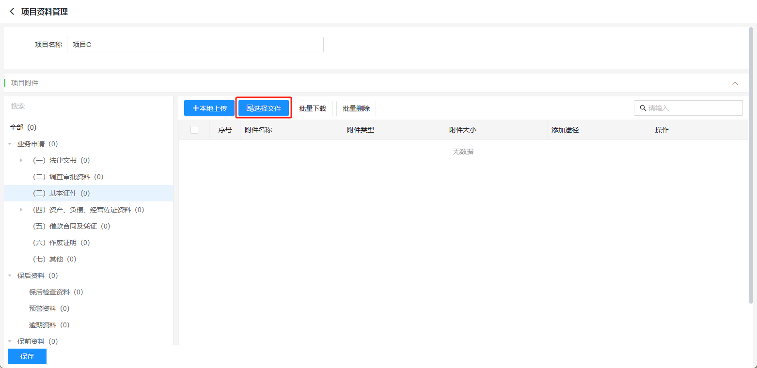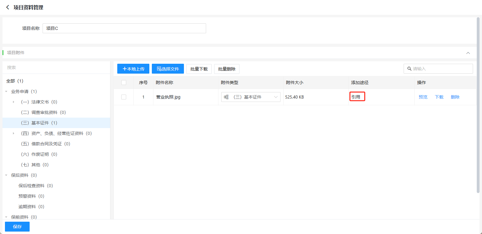 一般业务场景下,文件引用指的就是,通过选择已有的文件列表选择达成文件添加的目的。例如项目中,已经上传过一些项目资料涉及企业相关的一些信息,无需再次通过上传方式添加,可以引用已上传过的文件来添加。