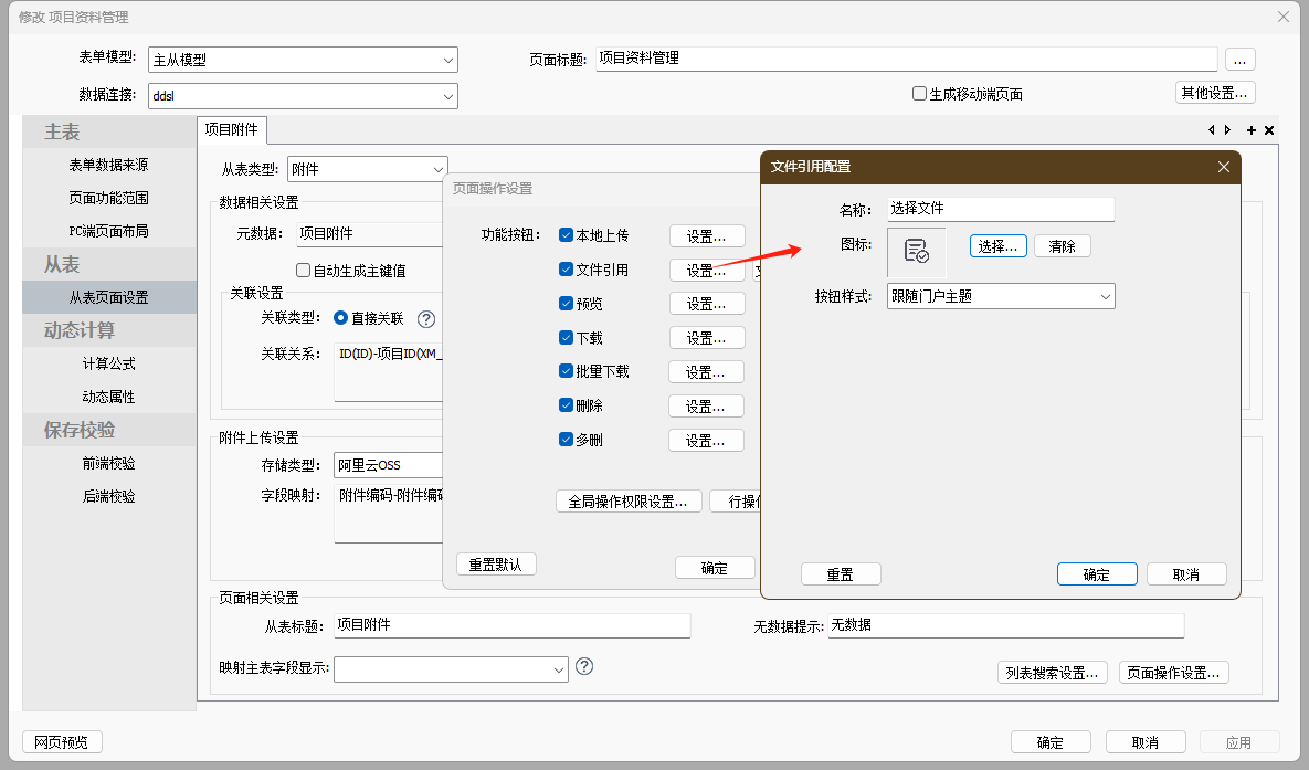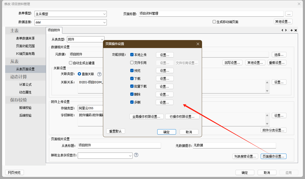 【页面操作设置】可以设置附件从表显示的操作功能。