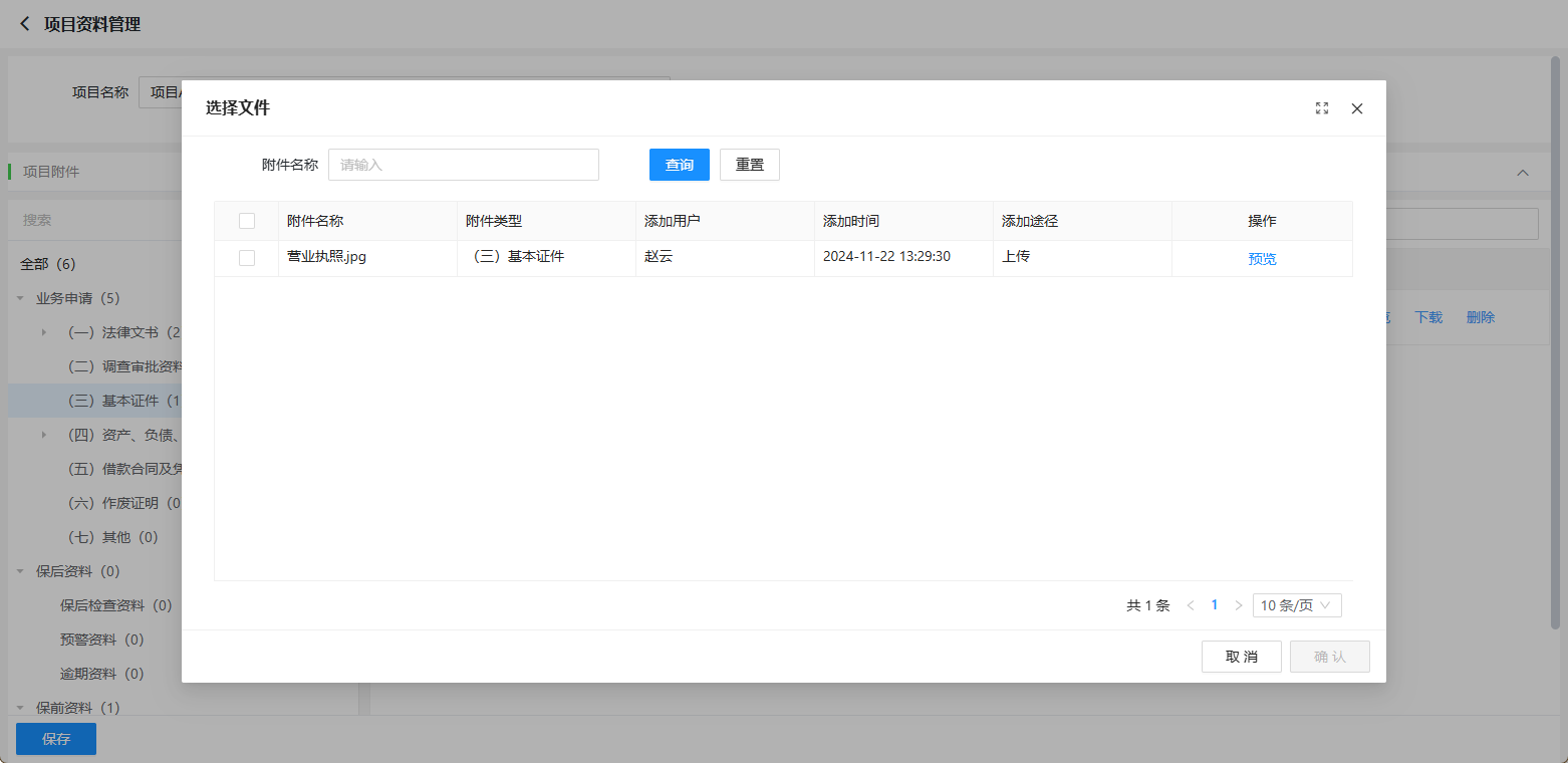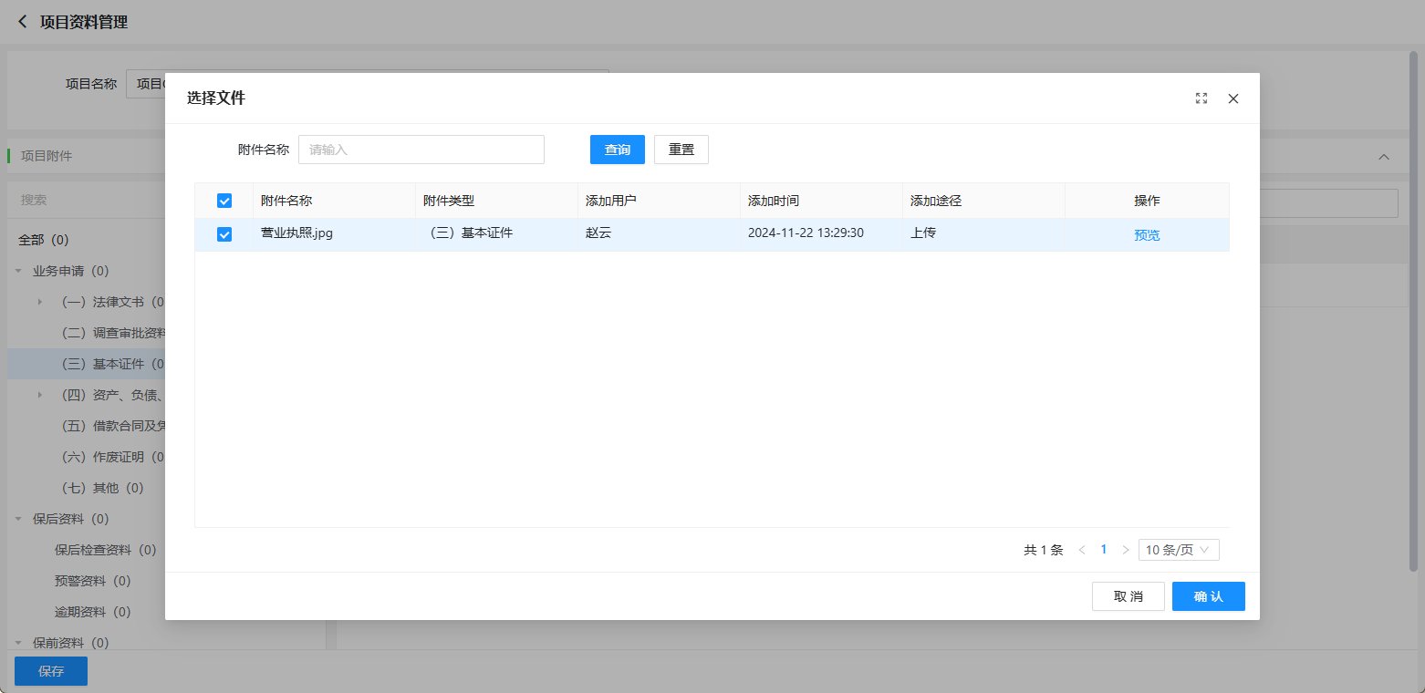 勾选文件,单击【确认】便可以将文件添加到附件从表中。