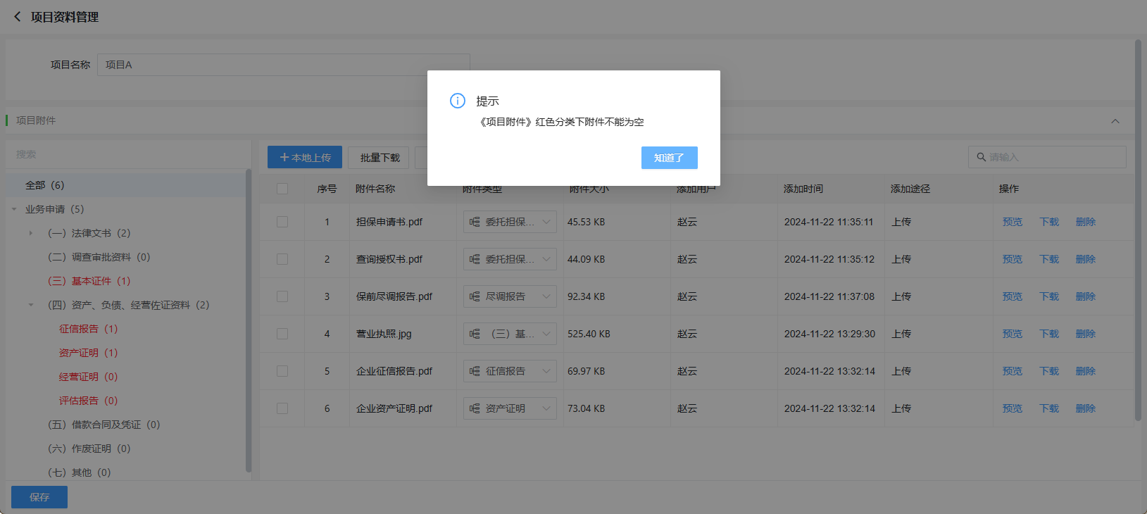 - 【分类必传校验】选配,用于实现某些细分场景,例如业务要求从表某些分类下必须上传文件,在表单保存时不得为空。这里的配置规则如下:允许自定义当前业务下必传的分类id,可以写常量也可以自行维护好数据,通过后台SQL函数去取值(多个分类id通过逗号分割)。例如示例中我们要求表单保存时,“基本证件”和“资产、负债、经营佐证资料”及其子分类下必须上传文件,就可以在此配置项中指定这几个分类的编码值。保存时校验分类必传,如果存在为空的分类提示如下图所示。