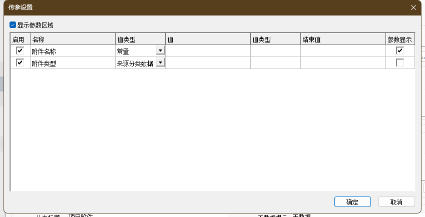 支持使用【引用范围】所选元数据的参数作为前端界面选择列表的参数栏,例如元数据中将字段“附件名称”设置为参数,支持在【传参设置】中对元数据参数进行重载。