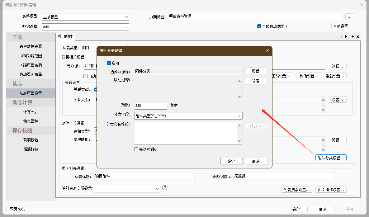 - 【分类字段】必选,如果需要对附件进行分类维护和展示,需要提前在从表元数据中准备好对应的用于存放分类信息的字段,例如示例中我们定义的字段FJ_TYPE就用于存放分类信息,这里就选择该字段作为分类字段。这里指定的分类字段主要有起到两个作用:1右侧列表添加附件时自动将当前所选项填充到该字段中存储下来,2选择左侧分类时过滤附件从表数据)