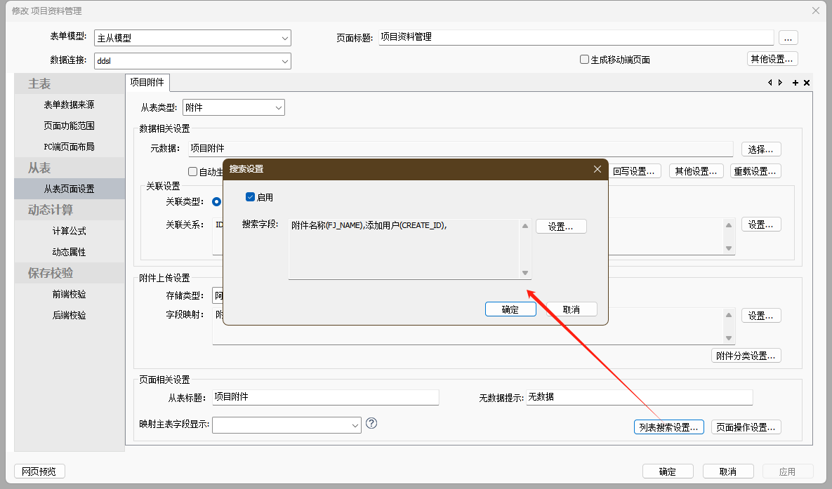【列表搜索设置】允许指定附件列表字段进行模糊查询,例如示例中我们选择支持“附件名称”和“添加用户”搜索。