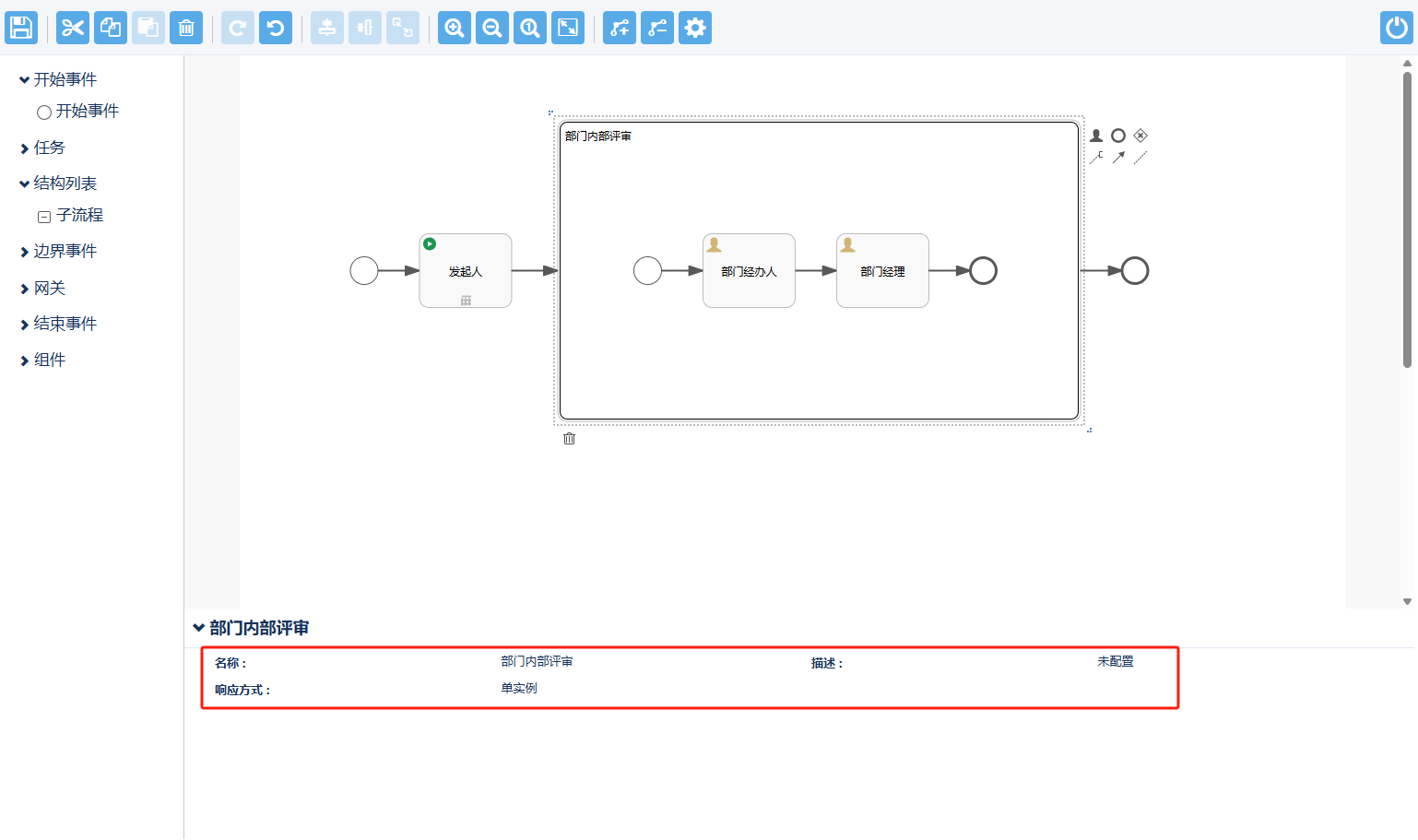 (2)与主流程不同,子流程无需配置发起人任务节点,可以直接在开始事件后配置其他类型任务;