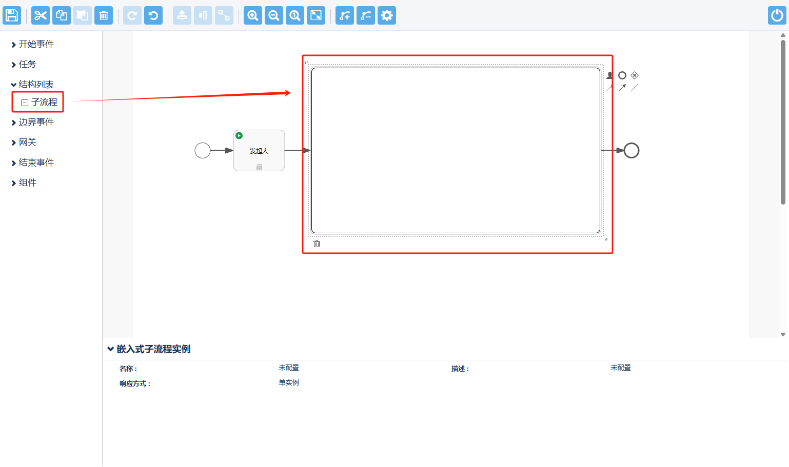 (1)嵌入式子流程必须包含一个开始事件(有且只有一个),且至少有一个结束节点;