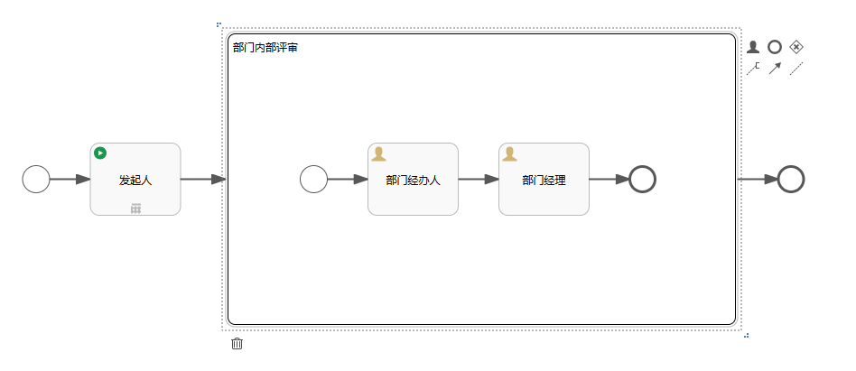例如我们设计一个子流程为部门内部流转,需经过部门经办人和部门主管审批,就可以如下图所示进行绘制。