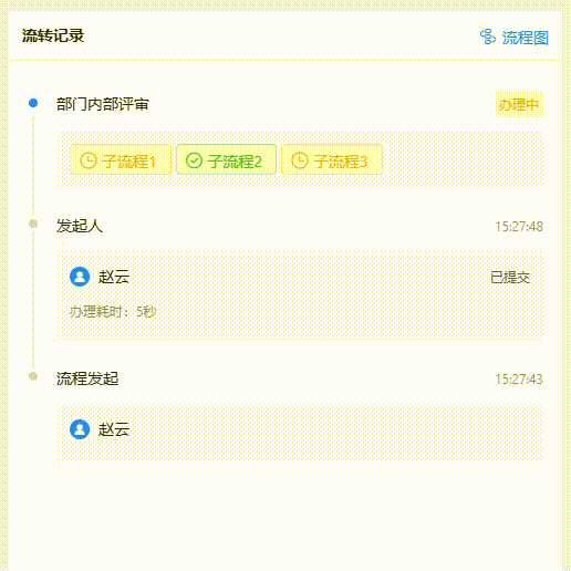 涉及多实例并行的子流程,在流转记录中体现为不同的子流程可以单独点开进行查看流程进度。(绿色的表示已结束,黄色的表示还在办理中)