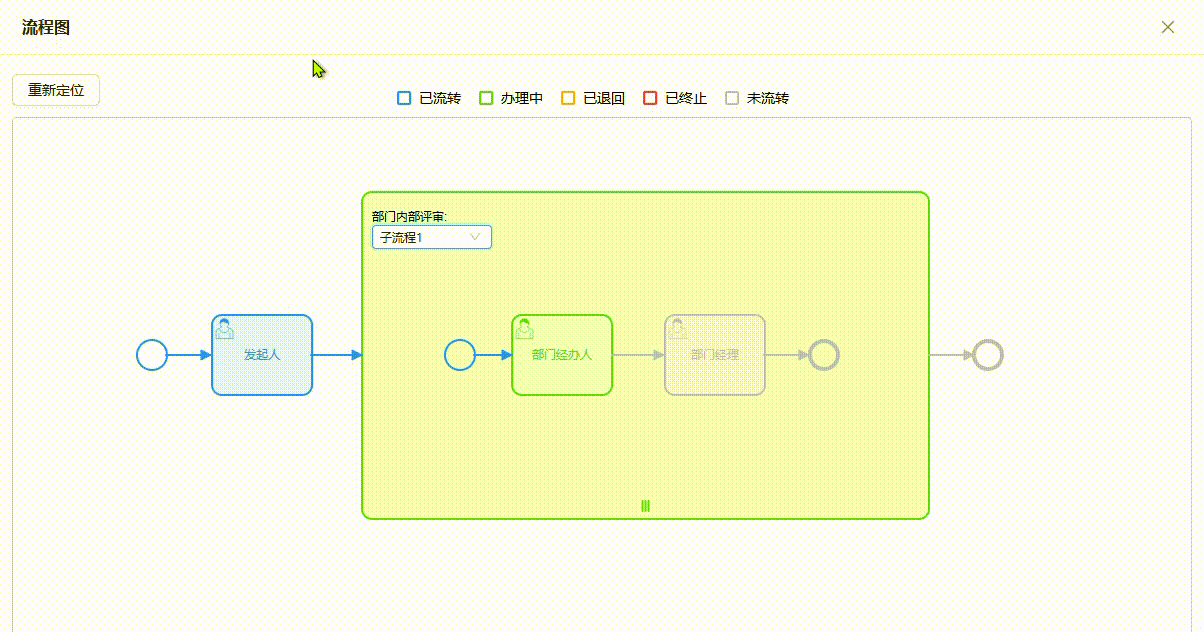 涉及多实例并行的子流程,在流程图上可以切换不同的子流程查看各自的进度。当子流程未完成时外框将显示为绿色,当子流程满足完成条件向后流转时外框显示为蓝色。