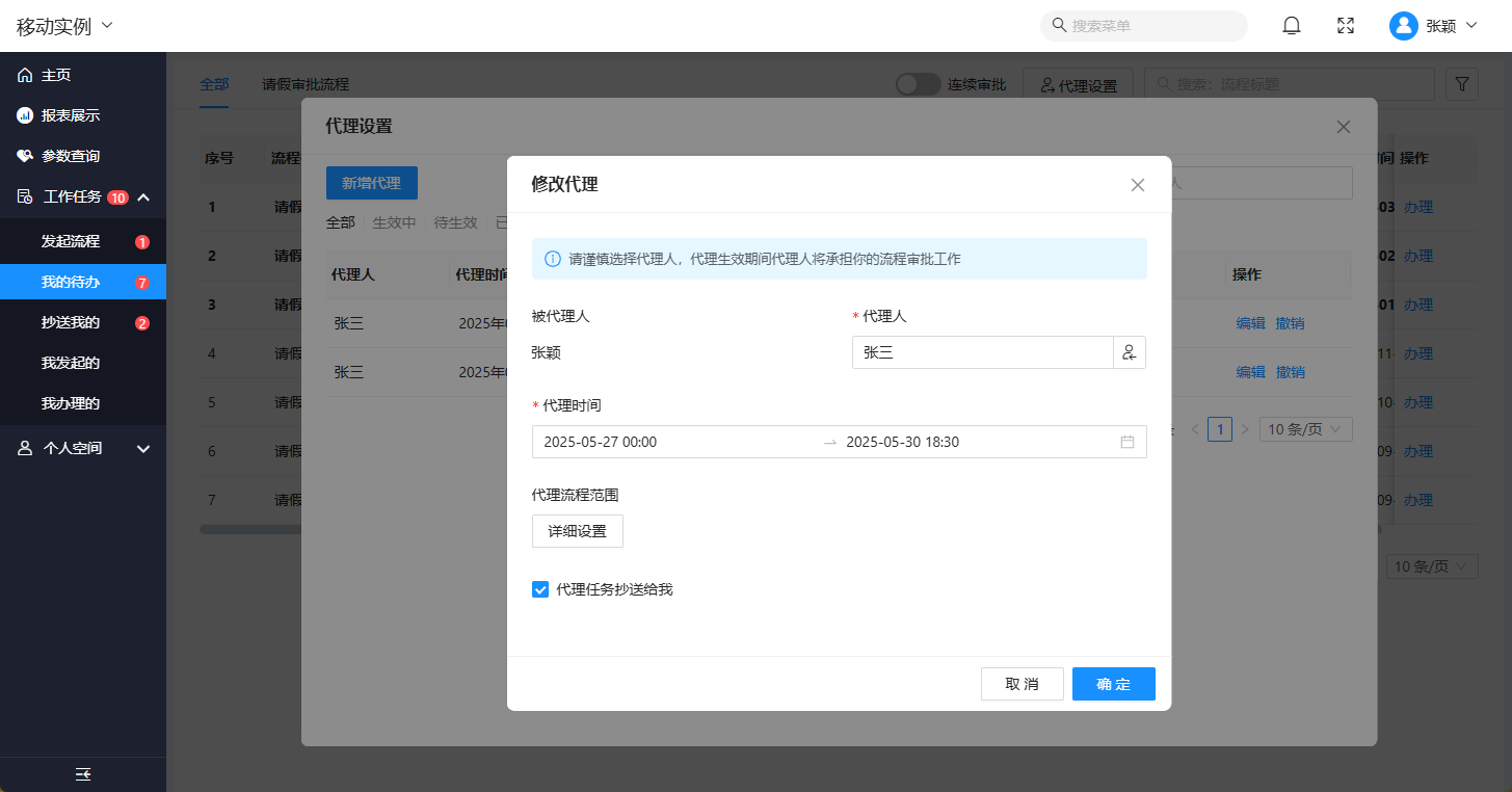 - 【代理任务抄送给我】默认勾选。勾选时,代理规则生效期间产生的待办任务被代理后,被代理人可以在【抄送我的】列表中关注到被代理的流程进展。