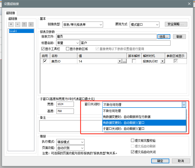 当链接单元格表单并选择模态窗口展现方式时,支持用户配置窗口关闭触发动作,用户可以通过该配置实现刷新动作。