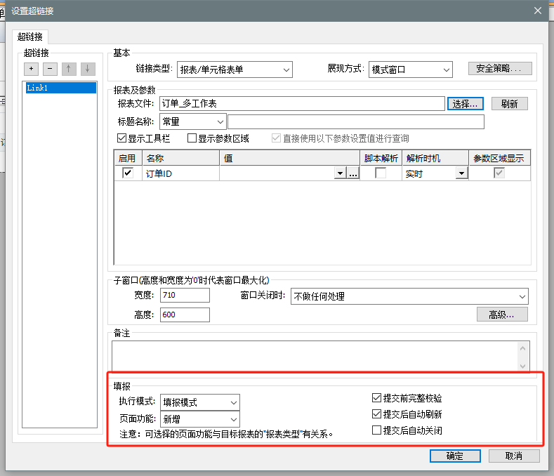 单元格链接报表模板时,根据选择的模板类型,若选择的是单元格表单,链接配置可配置填报相关选项。