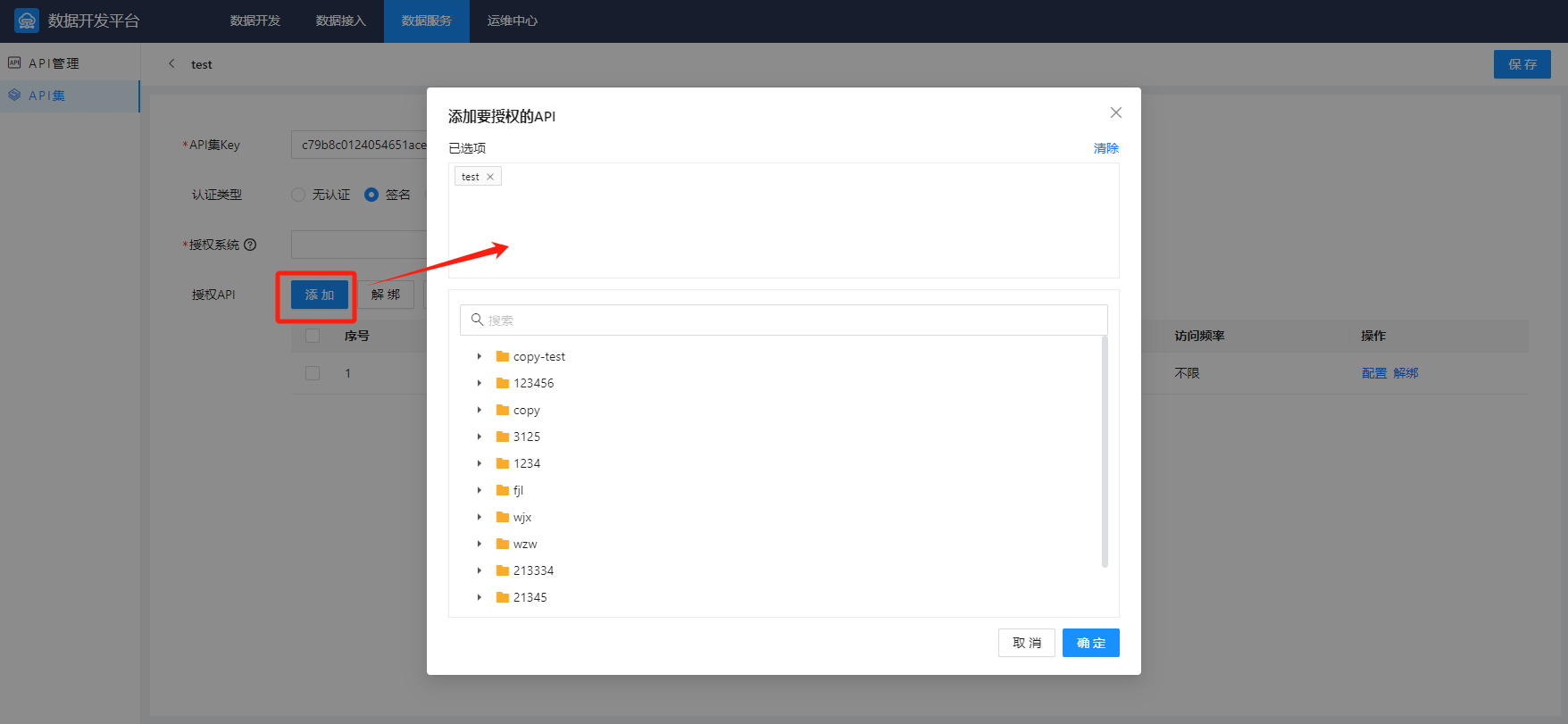 API 若想被调用必须绑定API集,将使用相同认证控制的API批量添加到该API集中。点击「添加」选择对应的API即可添加到当前API集中,如下图所示: