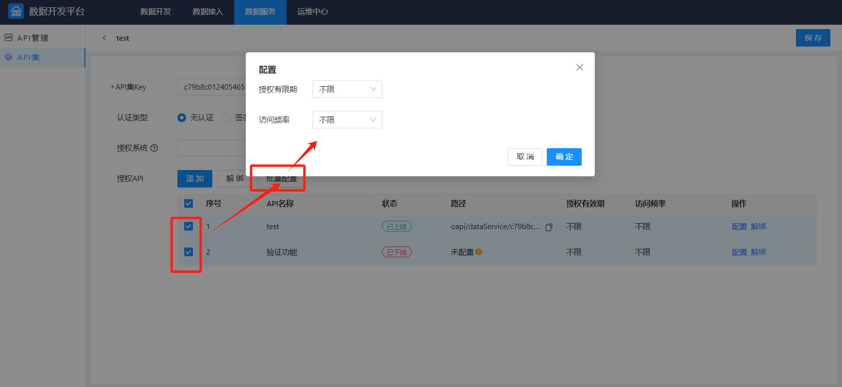 1)配置/批量配置:勾选已绑定的 API,点击「批量设置」,可以对 API 的认证方式授权有效期进行设置,同时可设置 API 被访问的频率,如下图所示:
