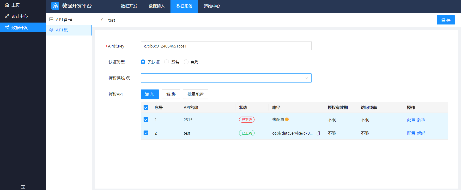 点击「数据服务>API集」,可进行API集的管理。如下图所示: