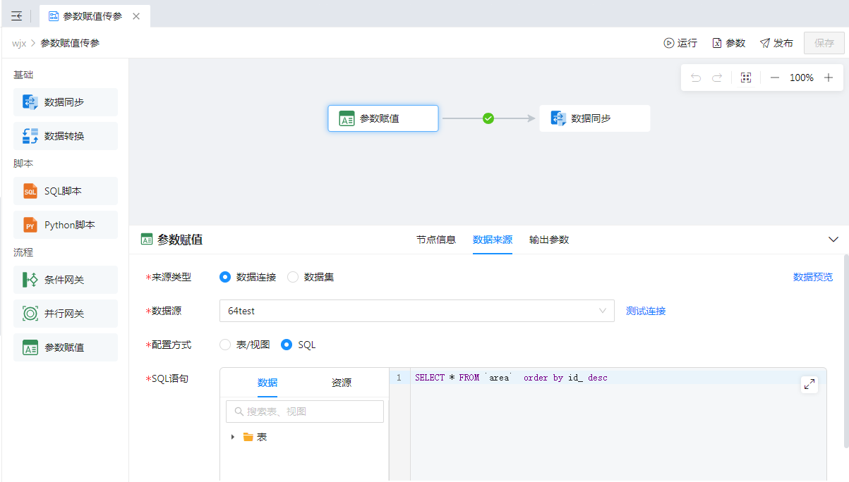 【参数赋值】可以通过[数据来源]将需要赋值的数据取出,并将数据表的行列数据为参数赋值,将获取到的数据输出为参数,供下游节点使用。
