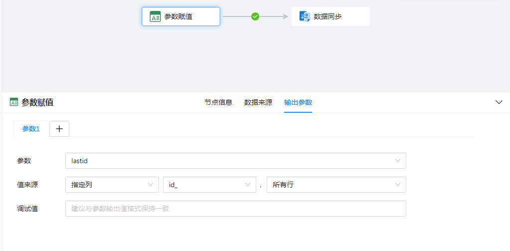 注:【参数赋值】中单个参数输出的字段值个数限制最多不能超过10000个。如果参数的输出结果超过限制,则该节点运行会失败。