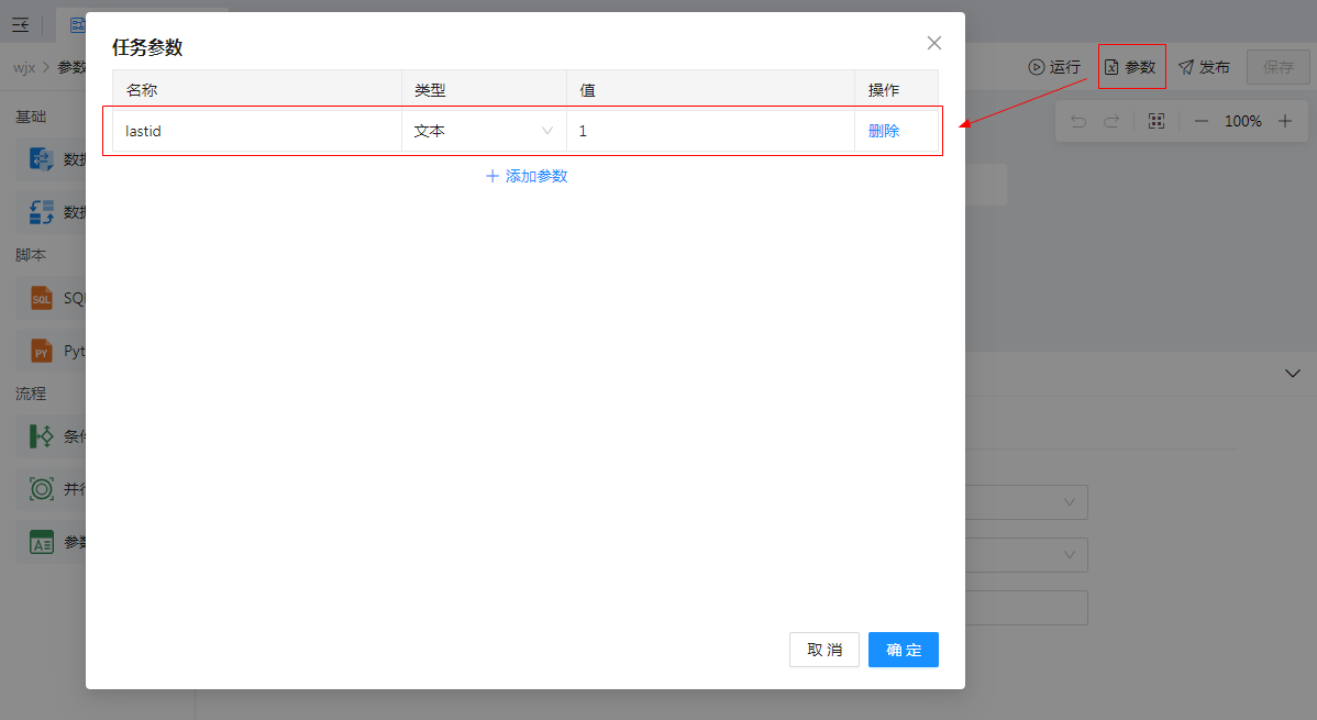 输出的参数需要先通过工具栏中的“参数”定义任务参数,如下图: